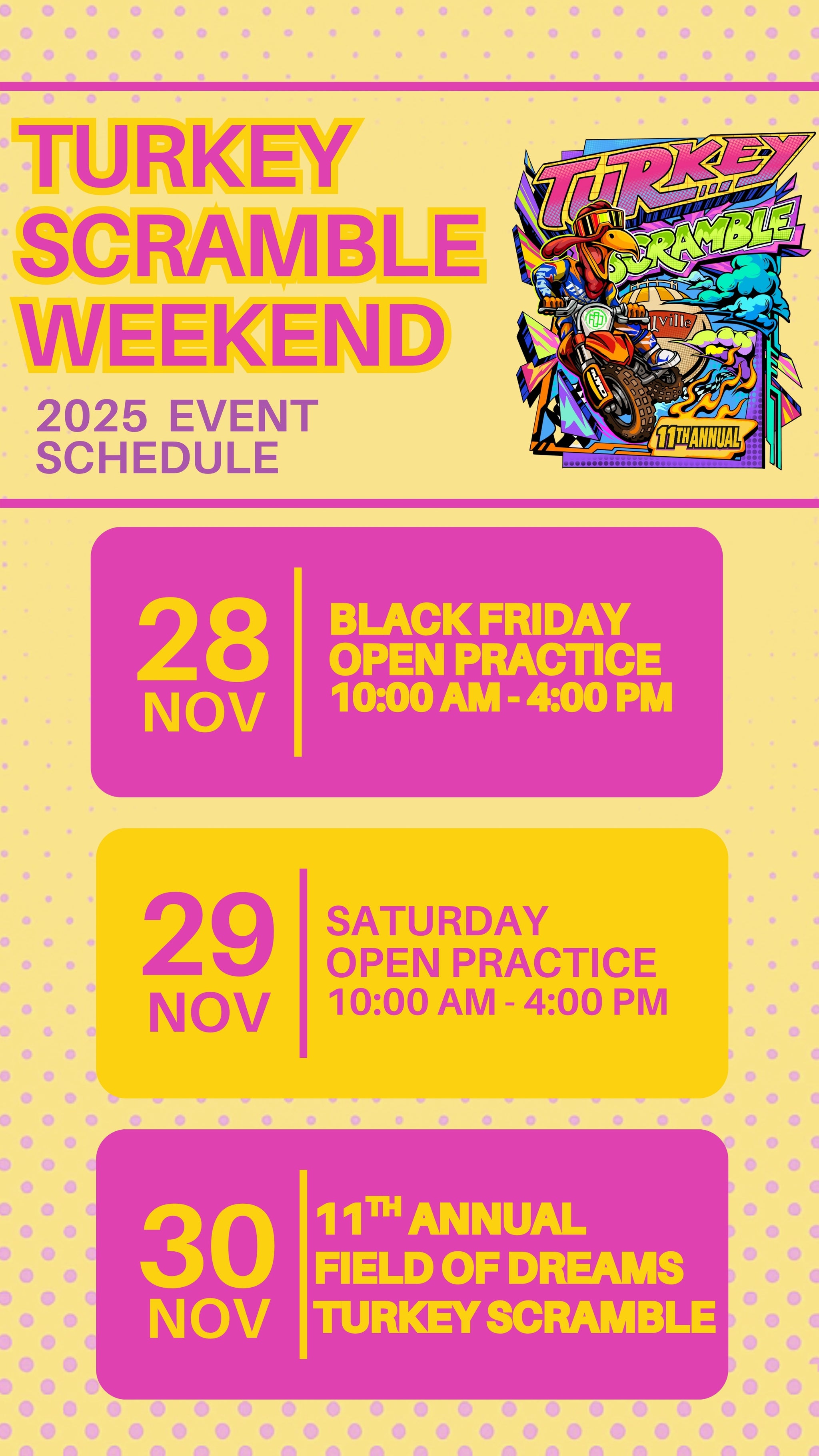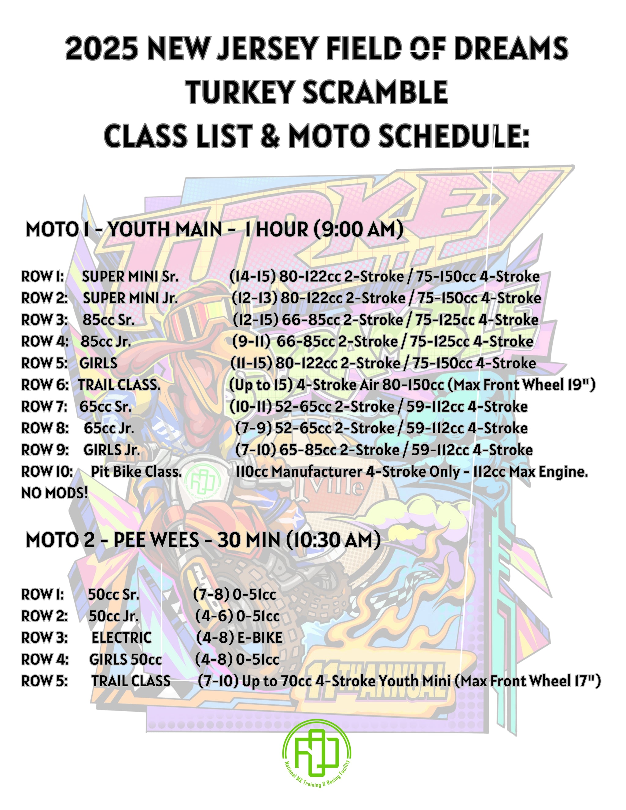 Let’s have a fantastic day of safe and spirited racing. Thank you for respecting the rules, and enjoy the Turkey Scramble at Field of Dreams!